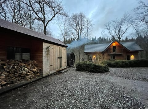 Dieses Ferienhaus wurde in den frühen 20er Jahren eröffnet und heißt dich mitten im Wald in Ruhe und Luxus willkommen. Es ist in Form eines Kreuzes gebaut und hat drei Etagen. Im Erdgeschoss gibt es ein großes Wohnzimmer mit Gaskamin, eine moderne Einbauküche und einen separaten, gemütlichen Essbereich für 12 Personen. Im ersten Stock gibt es drei Schlafzimmer (zwei mit Balkon) und ein großes Badezimmer mit Badewanne, Dusche und zwei Waschbecken. Dort findest du auch eine separate Toilette. Unter dieser Holzkonstruktion befindet sich ein weiteres Stockwerk, das durch eine breite Treppe mit dem Erdgeschoss verbunden ist. Dort findest du eine ruhige Ecke, zwei Schlafzimmer, ein Badezimmer mit Dusche und zwei separaten Waschbecken und eine separate Toilette. Das ganze Haus ist mit einer Zentralheizung ausgestattet. Draußen gibt es auf zwei Ebenen 4 Terrassen - 2 überdachte und 2 offene - mit Blick auf den unteren Fluss. Neben dem Chalet gibt es eine große holzbefeuerte Sauna für 6 Personen.