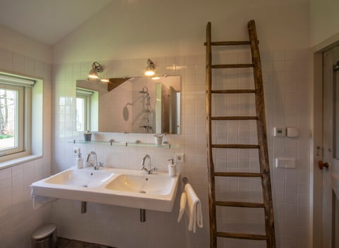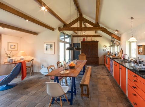 Ein herrlicher Ort, um zu entspannen und die Natur im Grünen Herzen zu genießen. Über eine kleine Brücke gelangst du auf eine Insel, einen schöneren Ort kann man sich kaum vorstellen. Versteckt von der Straße, in einer kleinen Apfelplantage, aber mit einem weiten Blick über die Wiesen des Grünen Herzens, garantiert dein Aufenthalt hier pure Ruhe. Das Naturhäuschen, das überraschend großzügig ist, hat viel zu bieten und ist komplett ausgestattet. Die fröhliche orangefarbene Küche lädt zum abendlichen Kochen ein, das Bücherregal und der Holzofen vervollständigen das Gefühl von Zuhause. Das Schlafzimmer ist mit einem schönen Bett, originellen Schränken und verträumten Vorhängen ausgestattet, die im Sommer sanft hin und her schaukeln, wenn du die Schiebetüren zum Garten geöffnet hast. Für Menschen, die Ruhe, Aussicht, Kunst, Kochen und Abgeschiedenheit suchen, ist dies der ideale Urlaubsort!