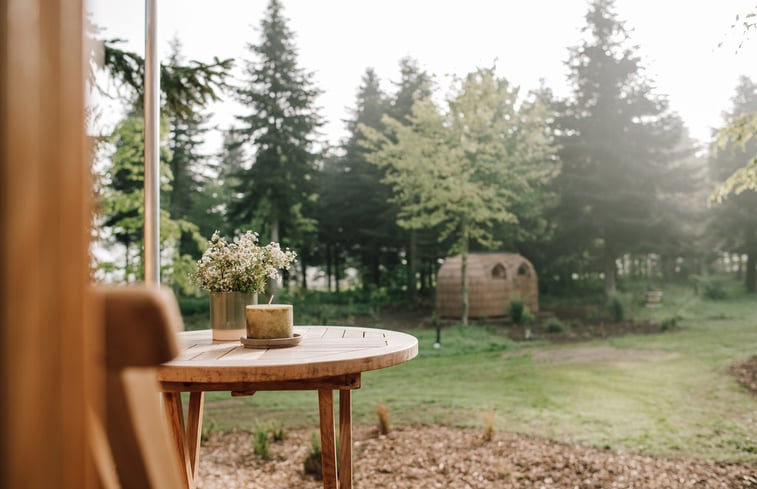 Das nachhaltige Raumwunder besteht aus drei Bereichen. Im Mittelteil kann man es sich auf der ausziehbaren Couch gemütlich machen und die Wärme des Kamins genießen. Zur Linken erschließt sich der Schlaf- und Arbeitsbereich inklusive ausreichender Stauraummöglichkeiten. Die vorderen Schranktüren dienen im geöffneten Zustand sogar als Abtrennung zum Wohnbereich. Egal ob man es sich im kleinen Erker mit dem 1,60 m Doppelbett gemütlich macht oder am Schreibtisch den Laptop aufklappt – von überall aus wartet der einzigartige Blick in die Natur. In der Dämmerung entdecken Sie vielleicht sogar ein vorbeihuschendes Reh. Auf der rechten Seite befindet sich eine voll ausgestatteten Küche inklusive Herd, Backofen und Spülmaschine sowie einem Küchentisch mit zwei Stühlen. Am hinteren Ende gibt es ein kleines Bad mit Dusche und WC.