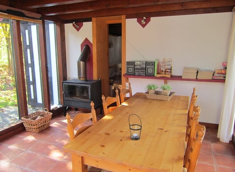 Charakteristisches Naturhäuschen mit Fachwerkfassaden. Perfekt für zwei, aber auch für bis zu vier Personen geeignet. Hier kannst du dich entspannen, zum Beispiel in dem großen, eingezäunten Garten, in dem Kinder sicher spielen können oder der Hund mitkommen darf. Im Erdgeschoss findest du neben einem Wohnzimmer mit offener Küche einen großen Wintergarten (Wintergarten). Ein schöner Ort, um sich nach einer langen Herbst- oder Winterwanderung vor dem Holzofen zu entspannen! Und wenn das Wetter mal nicht so gut ist, bist du immer noch von Grün umgeben. Im Obergeschoss befindet sich ein offener Raum mit zwei Einzelbetten (90x200) und wenn du daran vorbeigehst, gibt es ein weiteres separates Schlafzimmer mit einem Doppelbett (160x200). Dazwischen befindet sich das Badezimmer, die Toilette ist unten. Ansonsten findest du in dem Haus alles, was du für einen unbeschwerten Urlaub brauchst. Es gibt auch Wifi, aber bedenke, dass du dich am Ende des Landes und damit des Netzes befindest. Die Geschwindigkeit/Qualität lässt leider sehr zu wünschen übrig.