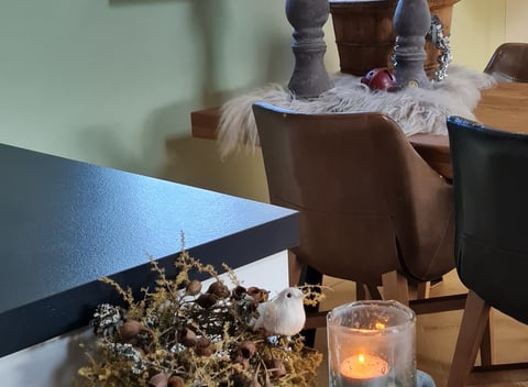 Komfortables, geräumiges und gemütliches Haus von 90 m2 für 2 Personen, 30 m vom Haupthaus entfernt; umfasst Wohnzimmer/Küche mit Fußbodenheizung, Kamin/Holzofen, Flur mit Toilette, großes Schlafzimmer mit Bad und Toilette. Es gibt einen Kühlschrank mit Gefrierfach, Besteck, Geschirr, eine Kaffeemaschine und einen Wasserkocher. Bitte beachte, dass das Haus nicht für Behinderte geeignet ist. Jeden Tag servieren wir sorgfältig ein leckeres Frühstück mit hausgemachten Backwaren. Die Gemeinde hat uns keine Genehmigung für einen Herd erteilt: Wir geben dir gerne Tipps zu den schönsten Restaurants und Take-Away-Adressen oder bieten dir an, für dich zu kochen. Fahrräder können im Holzschuppen abgestellt werden und das Auto kann in unserer Einfahrt geparkt werden.